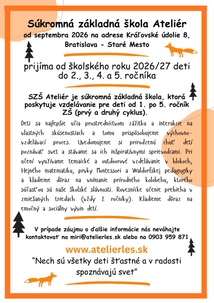 Sme malá škola, v jednom ročníku máme len 8 detí. Prednostne prijímame deti z Lesného klubu Ateliér LES. Stane sa, že máme voľné miesta aj pre externé deti a v takom prípade kontakujeme záujemcov z našej databázy. V prípade záujmu o navštevovanie SZŠ Ateliér môžete vyplniť dotazník a zaradíme vás do zoznamu záujemcov. Ďakujeme pekne